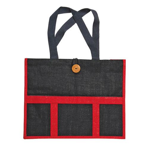 Two tone shopping bag with contrasting trims, outer pocket and button closure Dimension: 14″H * 18″W * 6″G
